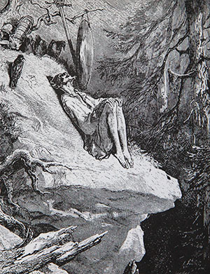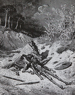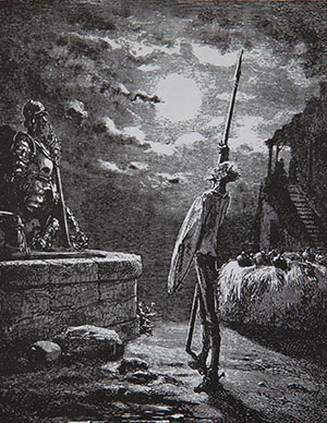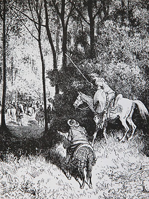 Встреча Дон Кихота с Рыцарем Белой Луны Самсоном Карраско. Рыцари сходятся в поединке. Дон Кихот побеждён. По условиям поединка он должен возвратиться домой.