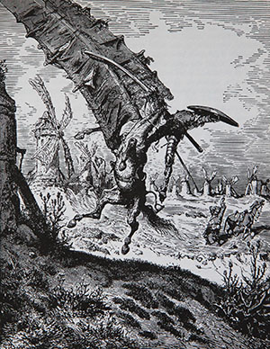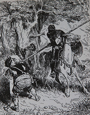 Дома он находит оруженосца по имени Санчо Панса. Дон Кихот обещает сделать оруженосца губернатором острова. Рыцарь и его оруженосец отправляются в очередное путешествие. Дон Кихот принимает ветряные мельницы за великанов и бросается в бой. Крылом мельницы его отбрасывает в сторону. Друзья останавливаются на ночлег. Мирно пасшийся с перевязанными передними ногами Росинант подобрался к стаду кобылиц, за что был бит пастухами, наши герои, подоспевшие на выручку коню, также были биты.