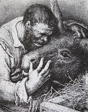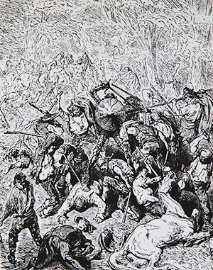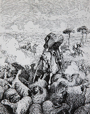 Дон Кихот принимает стадо баранов за войско и врезается в него на полной мощи. Бит пастухами. Один из ударов пришёлся в челюсть благородному рыцарю и лишил его половины зубов. Санчо Панса называет своего господина Рыцарем Печального Образа