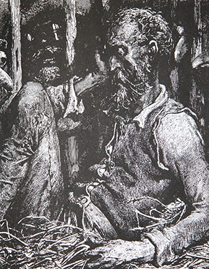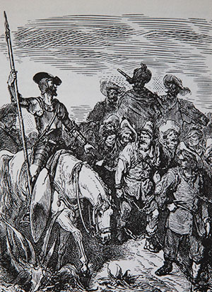 Дон Кихот отбивает у цирюльника медный таз для бритья, принимая его шлем Мамбрина. Рыцарь Печального Образа освобождает двенадцать конвойных и требует от них отправиться в Тобосо и передать сеньоре Дульсинее привет. Ответ на требование: Дон Кихот, Росинант, Санчо Панса и его ослик биты камнями.